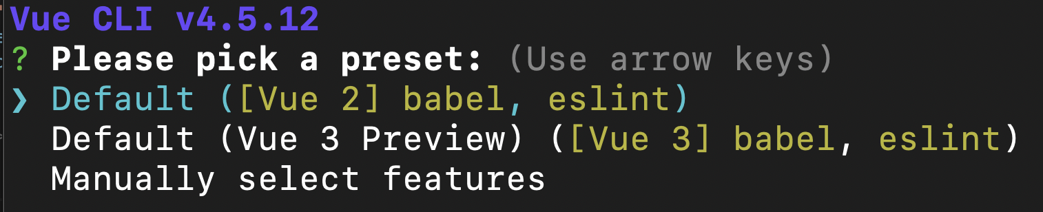 위 명령어를 치면 vue/cli를 타고 아래 화면을 띄워준다.