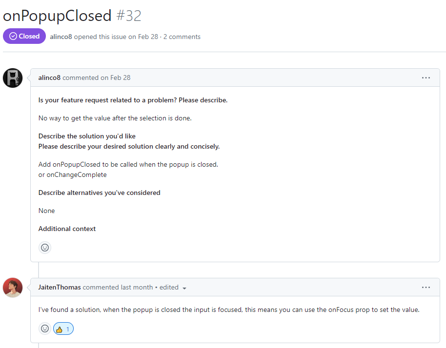질문이 올라온지는 몇 달 정도 지났지만 onFocus를 사용해서 해결했다는 답변은 바로 지난달에 올라왔던 것으로 기억해 이 해결책이 도움이 되었으면 좋겠다는 생각이 들었고 소소한 영어 실력으로 해당 issue에 여차저차 코멘트를 달았다,,,,